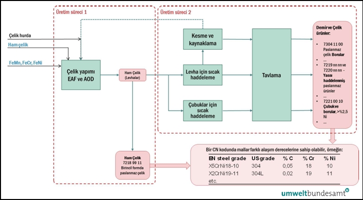 Örnek: Bir tesis çelik çubuklardan vida ve somun üretiyorsa, bu durumda çubuklar öncüdür; ancak hem çubuklar, hem de vidalar ve somunlar aynı toplu mal kategorisine dahildir.Vida ve somunların gömülü emisyonları, üretim sürecinin emisyonlarından (çubukların işlenebilir hale getirilmesi ve nihai ürünün tavlanması için uygulanan ısı) artı çelik çubukların gömülü emisyonlarından oluşacaktır. Bunun önemli olduğunu unutmayın çünkü öncü çubukların kütlesi ile son ürün vida ve somunların kütlesi aynı olmayacaktır; örneğin orijinal kütlenin %20’si kesilirse (ve hurda olarak atılırsa), 80 ton nihai ürün için 100 ton öncü gereklidir.Bazı demir veya çelik ürün türleri CBAM kapsamı dışında tutulmuştur. Bunlar özellikle CN 720246 ve CN 7204 (demirli atık ve hurda) kapsamındaki diğer bazı ferro alaşım türlerini içerir.Demir ve çelik sektörü ürünlerinin üretimi, aşağıda özetlenen bir dizi farklı işlem yoluyla gerçekleştirilir.İlgili üretim süreçlerinin ve kapsanan emisyonların tanımı ve açıklaması