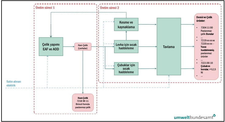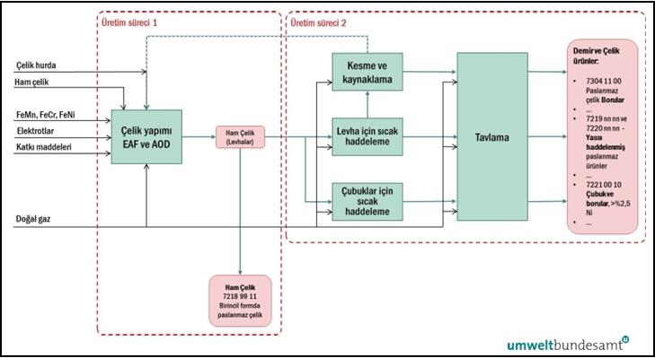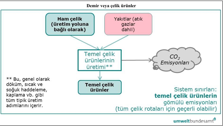 Şekil 5-5: Demir veya çelik ürünlerinin üretimi için sistem sınırları ve değer zinciri.