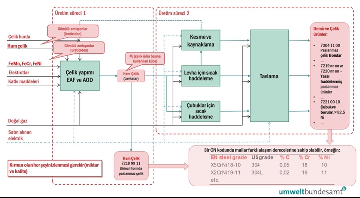 | Demir veya çelik ürünler | Ferro alaşımlar, pik demir, DRI, ham çelik, demir veya çelik ürünleri (süreçte kullanılıyorsa). |