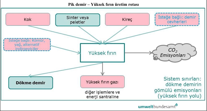 Uygulama Yönetmeliği, pik demir – Yüksek fırın üretim rotası için doğrudan emisyonların izlenmesine yönelik sistem sınırlarını aşağıdakileri kapsayacak şekilde tanımlar:- Kok, kok tozu , kömür, akaryakıtlar, plastik atıklar, doğal gaz, odun atıkları, odun kömürü gibi yakıtlardan ve indirgeyici maddelerden ve ayrıca kok fırını gazı, yüksek fırın gazı veya dönüştürücü gazı gibi atık gazlardan kaynaklanan CO2.