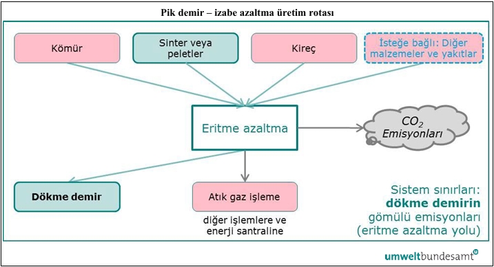 Izabe azaltma, farklı yakıtlar ve indirgeyici maddeler kullanılarak sinterlenmiş öncü cevherden, demir cevheri peletlerinden veya demir üretim artıklarından pik demir üretir. İşlem iki adımdan oluşur; demir cevherinin indirgenmesi ve ardından sıvı pik demir/sıcak metal üretmek için eritilmesi.Uygulama Yönetmeliği, pik demir – izabe azaltım üretim rotası için doğrudan emisyonların izlenmesine yönelik sistem sınırlarını aşağıdakileri kapsayacak şekilde tanımlar:“ – Kok, kok tozu, kömür, akaryakıt, plastik atıklar, doğal gaz, odun atıkları, odun kömürü gibi yakıtlardan ve indirgeyici maddelerden ve ayrıca kok fırını gazı, yüksek fırın gazı veya dönüştürücü gazı gibi atık gazlardan kaynaklanan CO2.