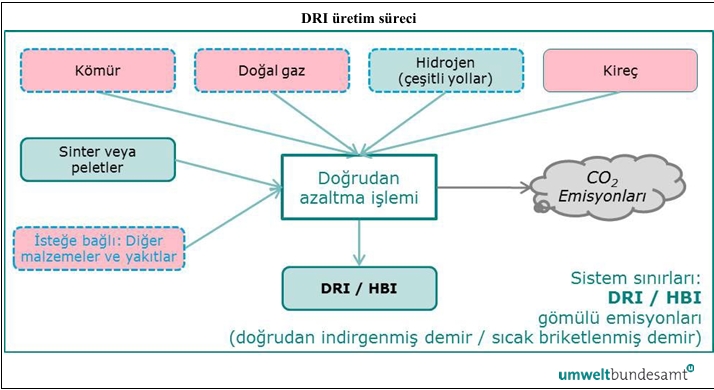 | Doğrudan İndirgenmiş Demir (DRI) | Hidrojen, sinterlenmiş cevher, ferro alaşımlar, pik demir/DRI (ikincisi, eğer diğer tesislerden veya üretim süreçlerinden elde ediliyor ve süreçte kullanılıyorsa). |