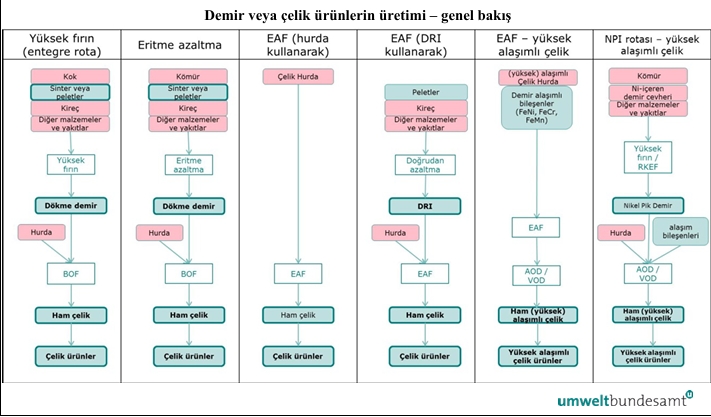 Aşağıdaki diyagram demir ve çelik ürünlerinin üretilebileceği çeşitli farklı yolları göstermektedir.
