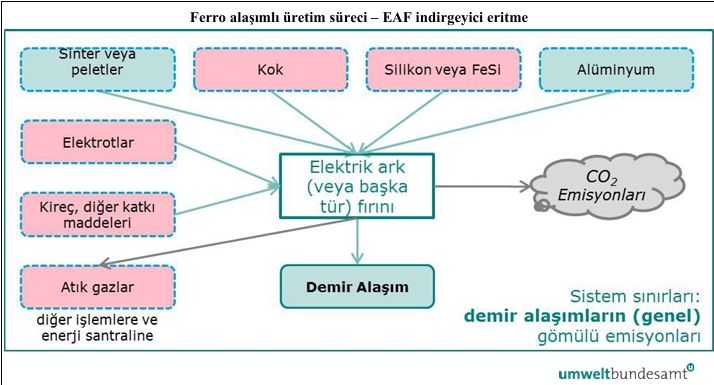 Bu süreç, 7202 1, 7202 4 ve 7202 6 CN kodları altında tanımlanan ferro-manganez (FeMn), ferro-krom (FeCr), ferro-nikel (FeNi) alaşımlarının üretimini kapsar. Spiegeleisen gibi önemli alaşım içeriğine sahip diğer demir malzemeler burada kapsanmamaktadır. Bununla birlikte, nikel içeriği %10’dan fazla ise nikel pik demir (NPI) dahil edilir; aksi takdirde, %10’dan az ise NPI pik demir – yüksek fırın üretim rotası kapsamındadır.Farklı ferro alaşımlar, diğer katkı maddelerinin yanı sıra kok gibi bir indirgeyici maddenin EAF’ye eklenmesiyle indirgeyici eritme yoluyla üretilir. Demir alaşımlı üretimsürecine bağlı olarak farklı türde EAF kullanılabilir; Ferro-nikel, eritme öncesinde ek bir kalsinasyon ve ön indirgeme üretim aşamasına sahiptir. EAF eritme işleminin ardından sıvı metal alaşımı boşaltılır ve kalıplara dökülür ve katılaşan metal daha sonra müşteri gereksinimlerine bağlı olarak ezilir veya granüle edilir.Uygulama Yönetmeliği, ferro alaşımlar FeMn, FeCr ve FeNi pik demir üretim süreçlerine yönelik doğrudan emisyonların izlenmesi için sistem sınırlarını aşağıdakileri kapsayacak şekilde tanımlar:“ – Enerjili veya enerjisiz kullanım için kullanılıp kullanılmadığına bakılmaksızın, yakıt girdilerinden kaynaklanan CO2 emisyonları.